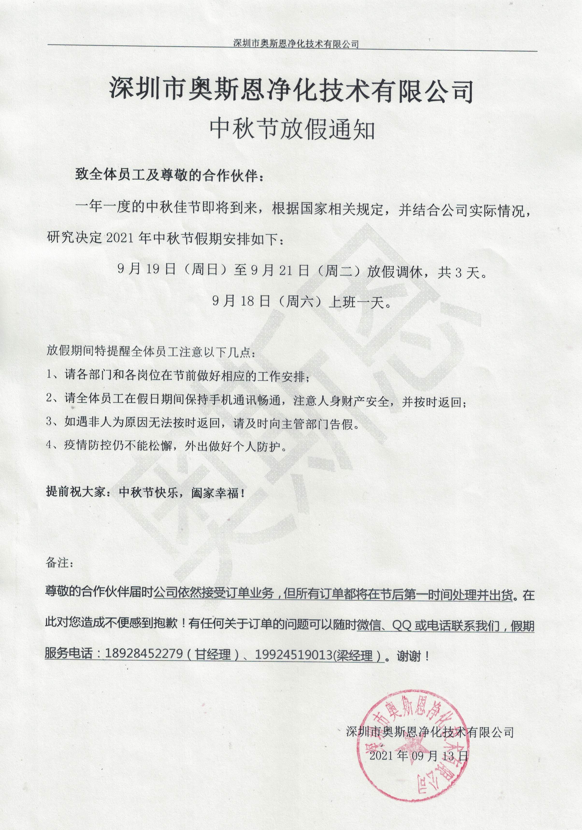 深圳奧斯恩中秋節(jié)放假通知