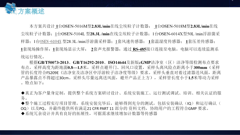 本系統(tǒng)以及定制化服務(wù)能滿足用戶在潔凈室的生產(chǎn)區(qū)域?qū)崿F(xiàn)在線粒子連續(xù)監(jiān)控的要求,潔凈室的所有采樣點同時監(jiān)測0.5um和5.0um的粒子狀況,符合GB50073-2013、ISO14644、GB/T16292-2010、美國FDA、歐洲EU GMP、及中國現(xiàn)行cGMP的相關(guān)規(guī)定。