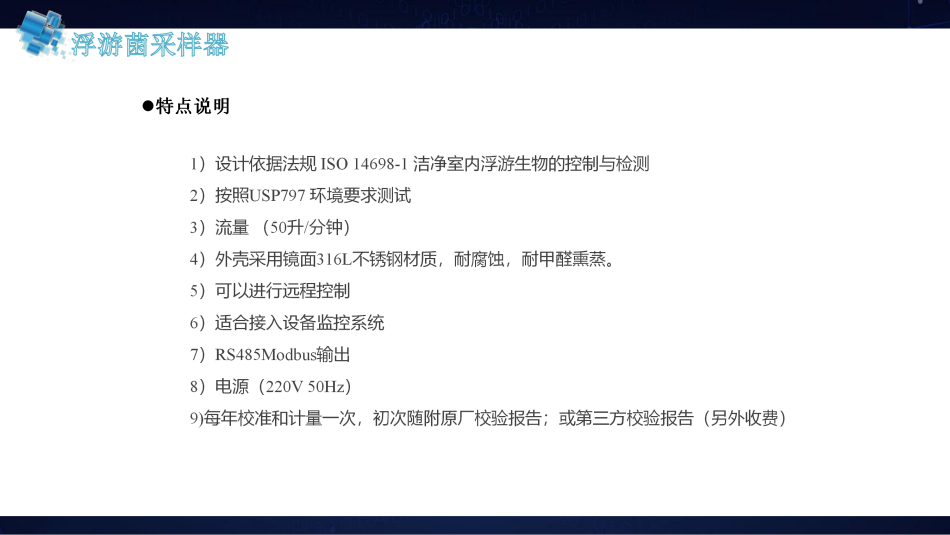 將在線式塵埃粒子計數(shù)器安裝在潔凈室區(qū)域,可避免人為干擾,主控電腦遠(yuǎn)程監(jiān)控各采樣點粒子狀況,監(jiān)測結(jié)果直接傳送到主控電腦,實現(xiàn)在線多點監(jiān)測、遠(yuǎn)程集中控制管理,大幅度提高了潔凈空間的監(jiān)測質(zhì)量和水平,是藥品生產(chǎn)進(jìn)行全面貫徹 GMP 規(guī)范所必需的環(huán)境監(jiān)測設(shè)備,是電子廠、醫(yī)院手術(shù)室、航空航天、精密加工、食品行業(yè)等潔凈場景提高生產(chǎn)環(huán)境監(jiān)控質(zhì)量從而提高產(chǎn)品良品率的必備儀器,計數(shù)器計數(shù)效率及準(zhǔn)確度符合國家計量總局頒布的JJF1190-2008《塵埃粒子計數(shù)器校準(zhǔn)規(guī)范》規(guī)程的技術(shù)要求。