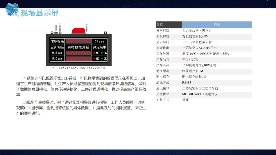 生產(chǎn)現(xiàn)場配備操作屏或者顯示屏操作或顯示現(xiàn)場房間監(jiān)控數(shù)據(jù),使得操作更方便,顯示更直觀,從而提高組織效率。