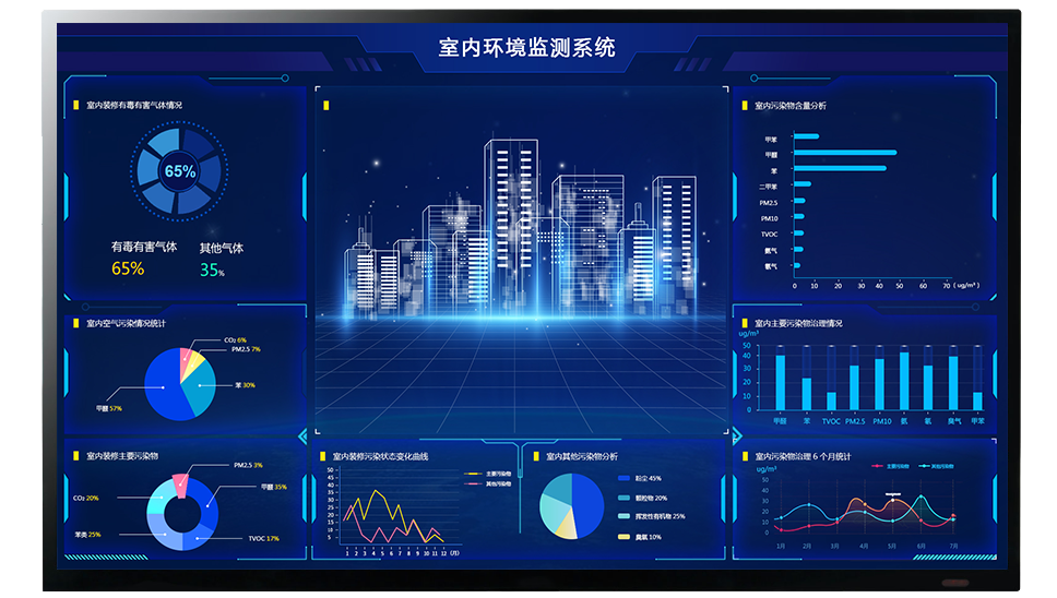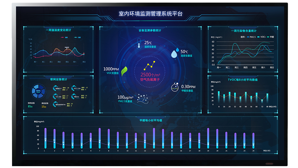 室內(nèi)空氣質(zhì)量監(jiān)測(cè)軟件平臺(tái),主要依托于大數(shù)據(jù)可視化分析模型進(jìn)行建設(shè),數(shù)據(jù)24小時(shí)全天侯實(shí)時(shí),接收、保存,并通過圖表等形式具象化顯示、智能分析、智能告警提醒/管理,自動(dòng)生成報(bào)表分析,集數(shù)據(jù)與視頻于一體,實(shí)現(xiàn)污染溯源、趨勢(shì)預(yù)測(cè)等功能,充分貫徹總量管理、總量控制的原則,包含了環(huán)境管理信息系統(tǒng)的許多重要功能